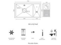 - Kích thước bồn rửa : 760 x 480 x 220 mm